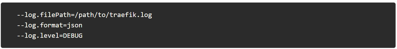 日志方面,这是一个快速的三步过程: 1. 设置 filepath. 2. 设置 format (json 或 text)。3. 设置 level. 此示例展示了如何在 Traefik CLI 中执行此操作,但您也可以使用 YAML 或 TOML 配置文件。